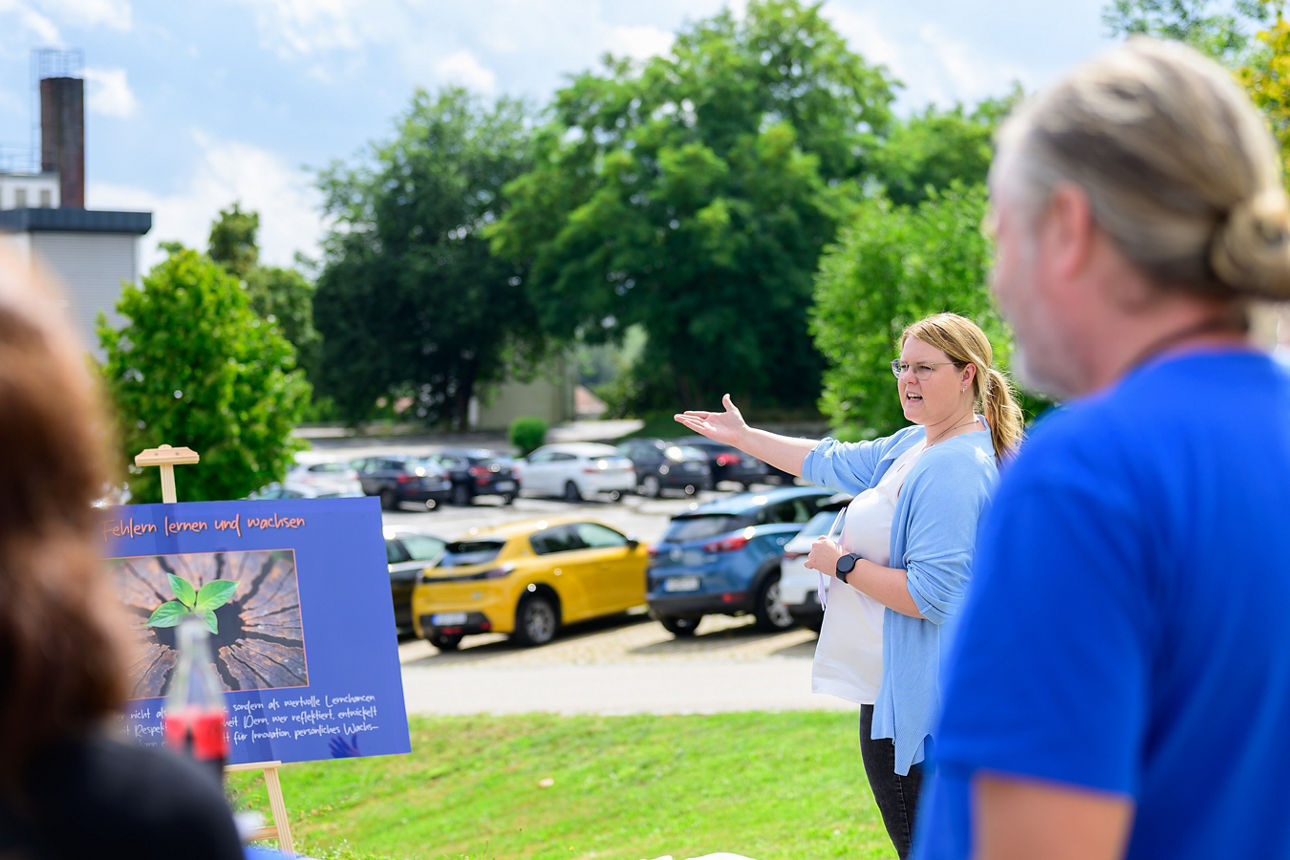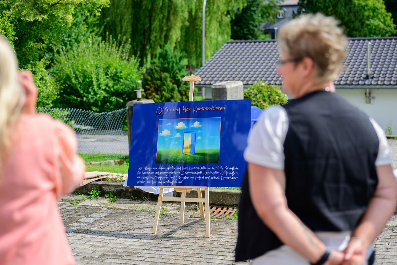Höhepunkt der Veranstaltung war der interaktive Hauptteil: Die Führungskräfte hatten sich kürzlich in Rosenau getroffen und dort sieben neue Führungsgrundsätze erarbeitet. Diese wurden nun in kleinen Gruppen an eigens gestalteten Marktständen präsentiert – lebendig, praxisnah und motivierend. Die Mitarbeitenden konnten so nicht nur zuhören, sondern auch direkt mitdiskutieren und mitgestalten.