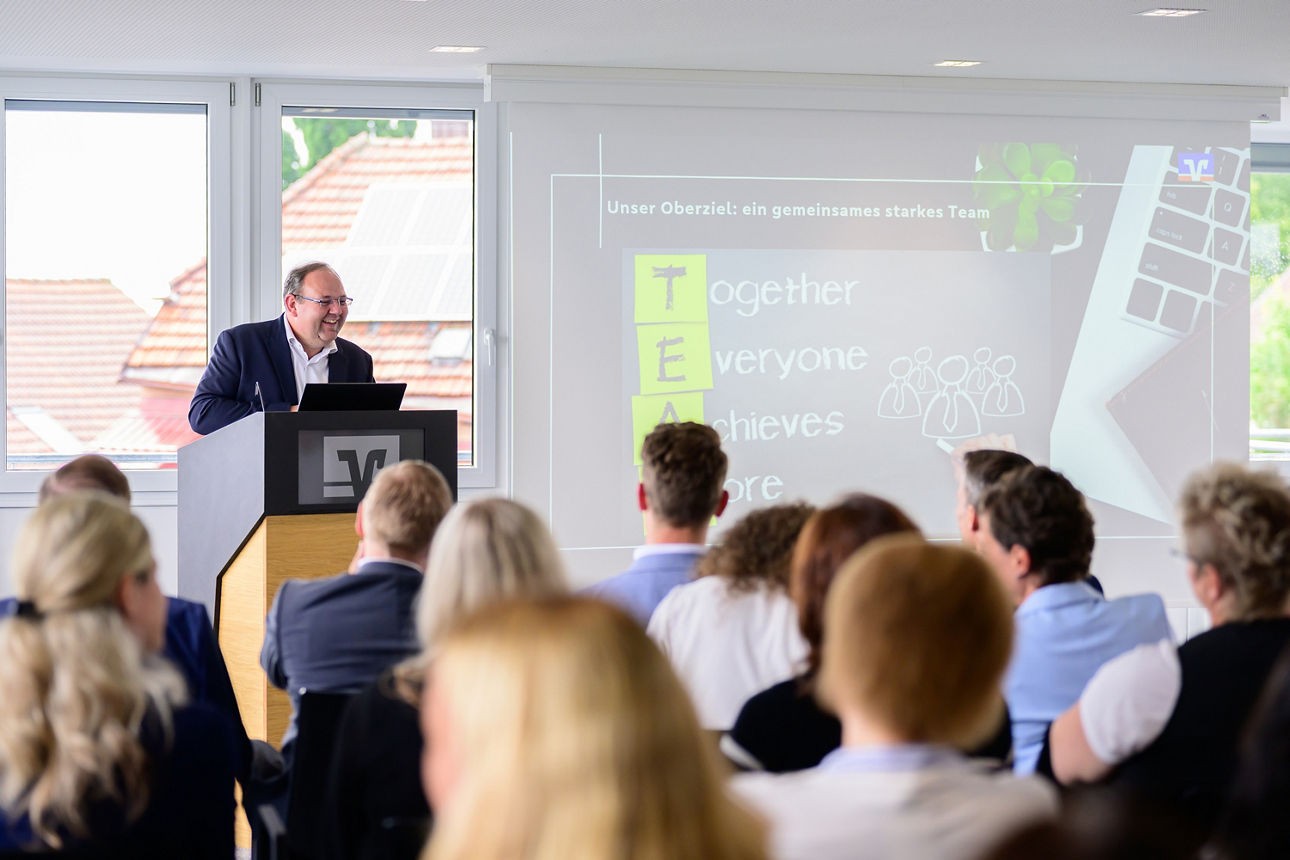 Im Anschluss begrüßte er neue Kolleginnen und Kollegen, die in den vergangenen Monaten zur Bankfamilie gestoßen sind – ein schönes Zeichen des Wachstums.
